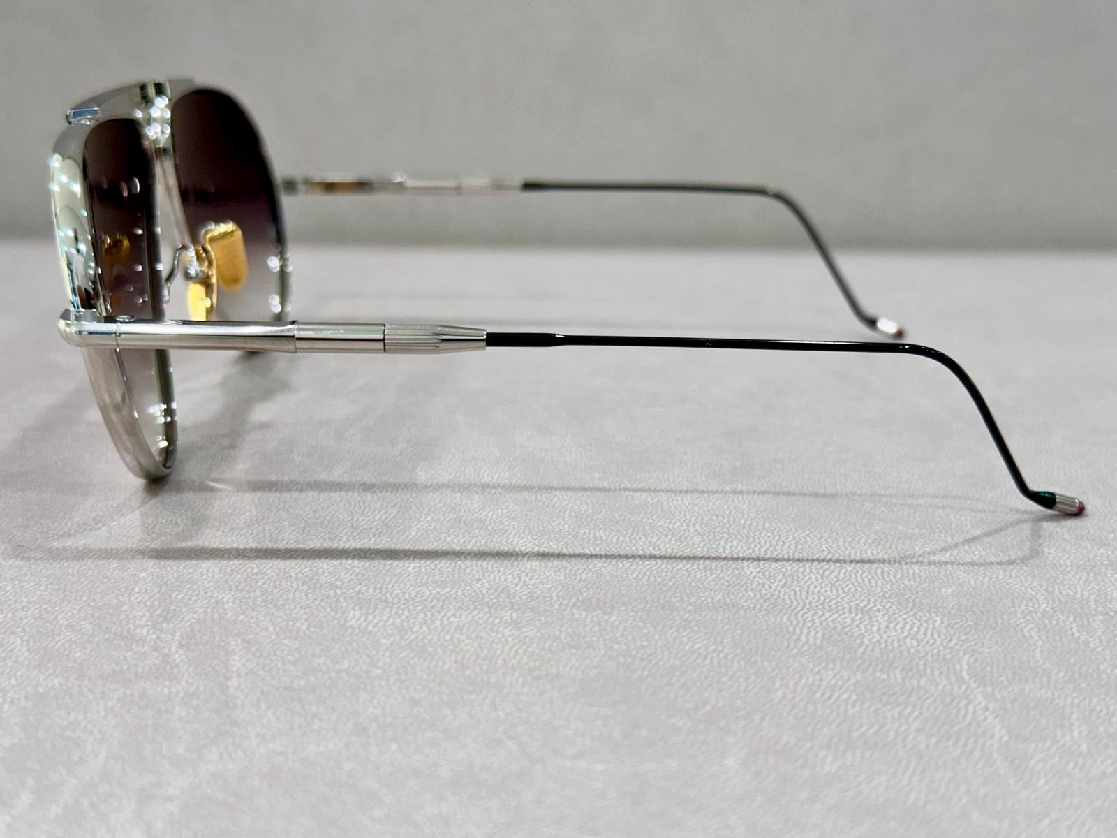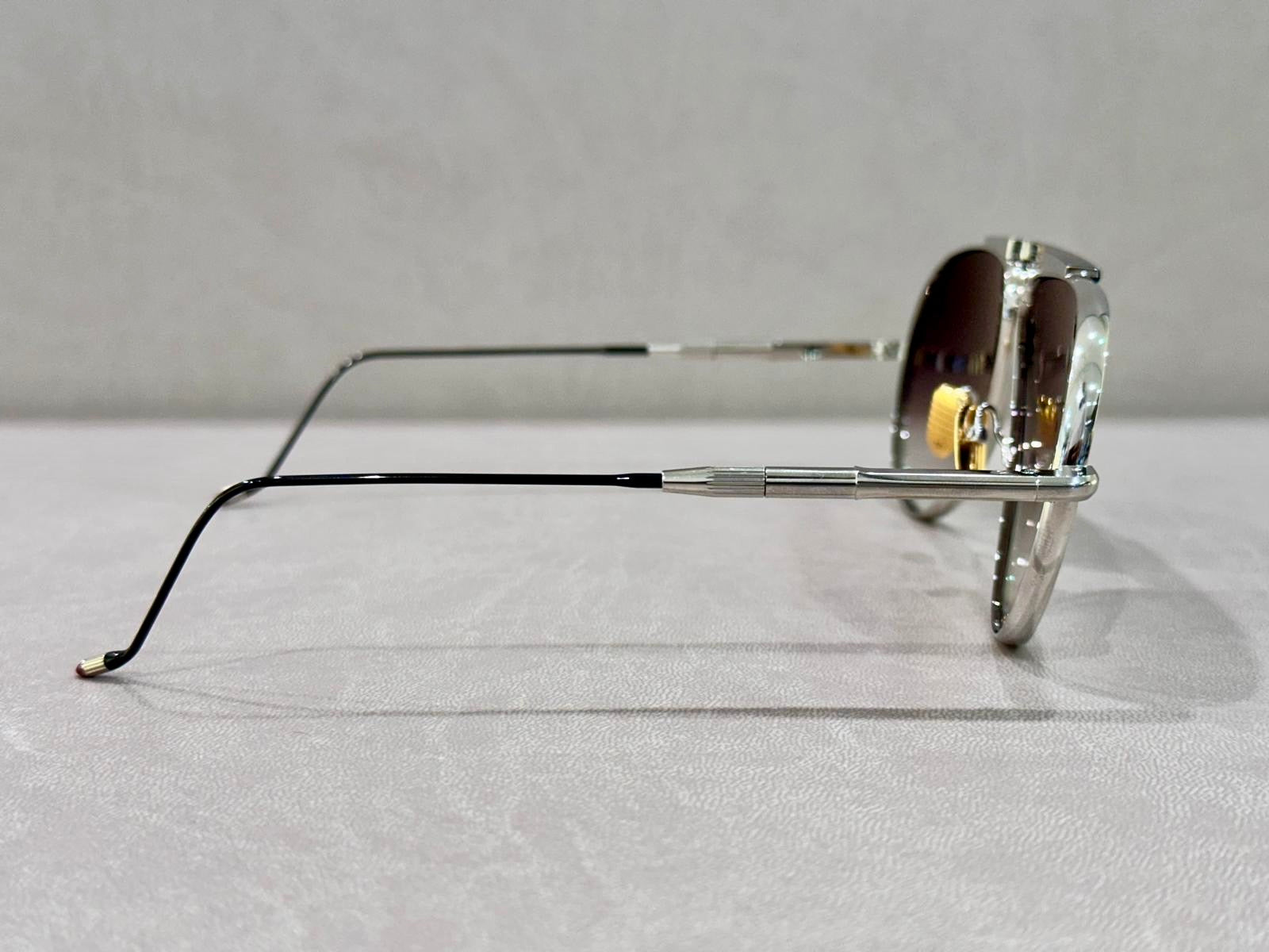 Ispirandosi a questa eredità, Jacques Marie Mage presenta il suo primo capolavoro in titanio: un occhiale da sole aviator in edizione limitata, con lenti a goccia profonde e aste estensibili, impreziosito da un ponte esclusivo caratterizzato da una raffinata depressione circolare e dettagli incisi in stile Art Déco, insieme al logo distintivo del brand.
