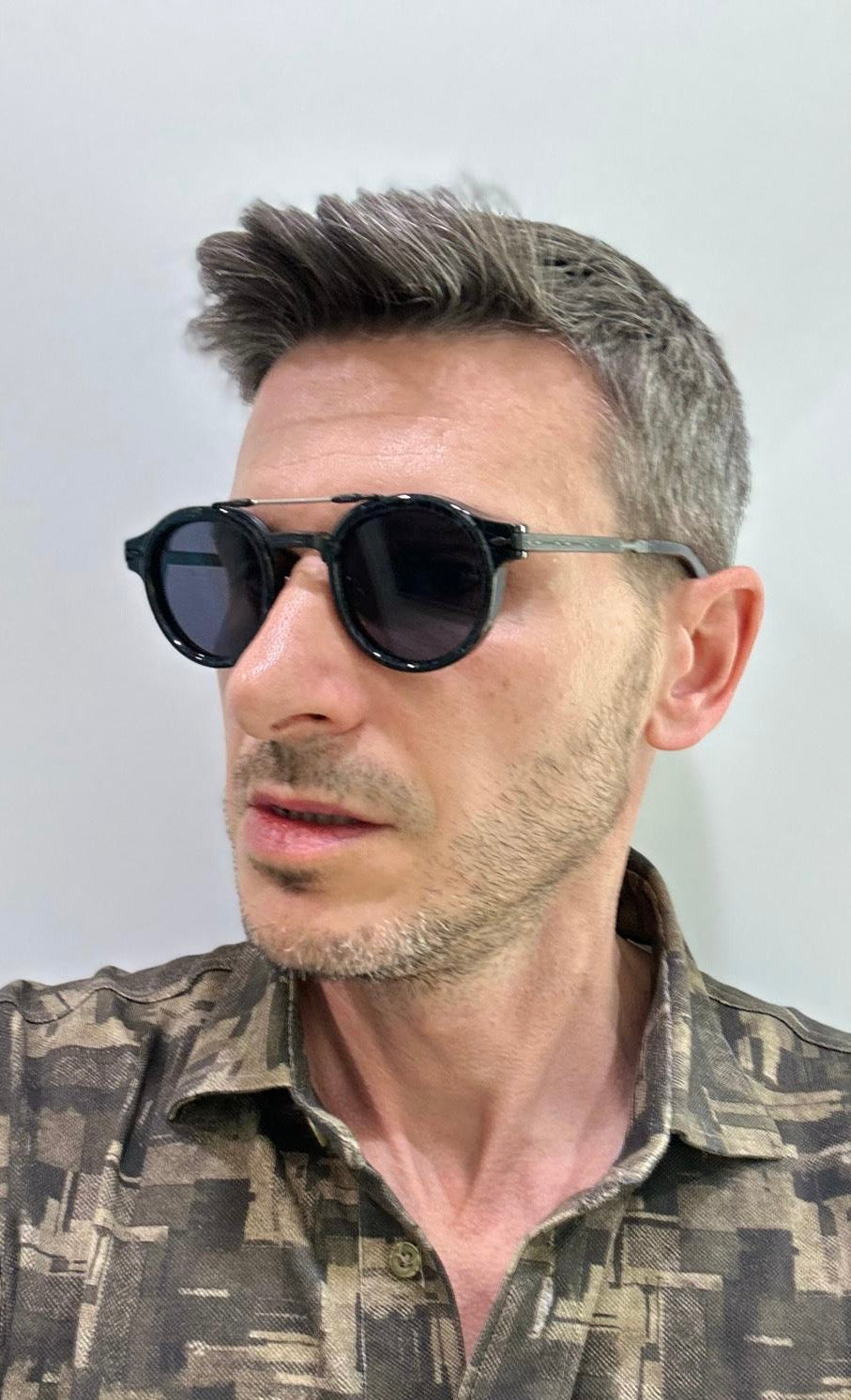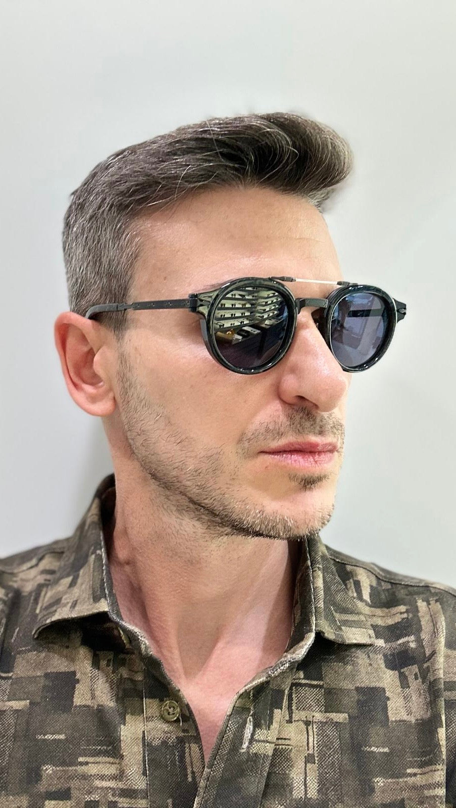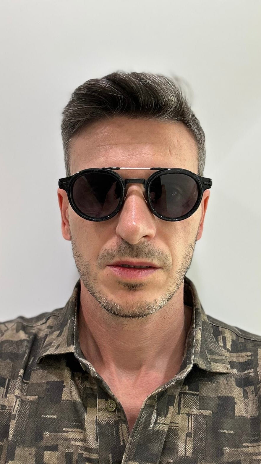 Questi occhiali combinati presentano lenti rotonde in acetato massiccio dal fascino anni ’50. Il ponte è arricchito da un dettaglio in titanio, mentre la cerniera monoblocco, impreziosita dal celebre logo, e le aste finemente incise con l’esclusivo motivo a “punta di freccia” conferiscono al modello un’eleganza raffinata e un carattere inconfondibile.