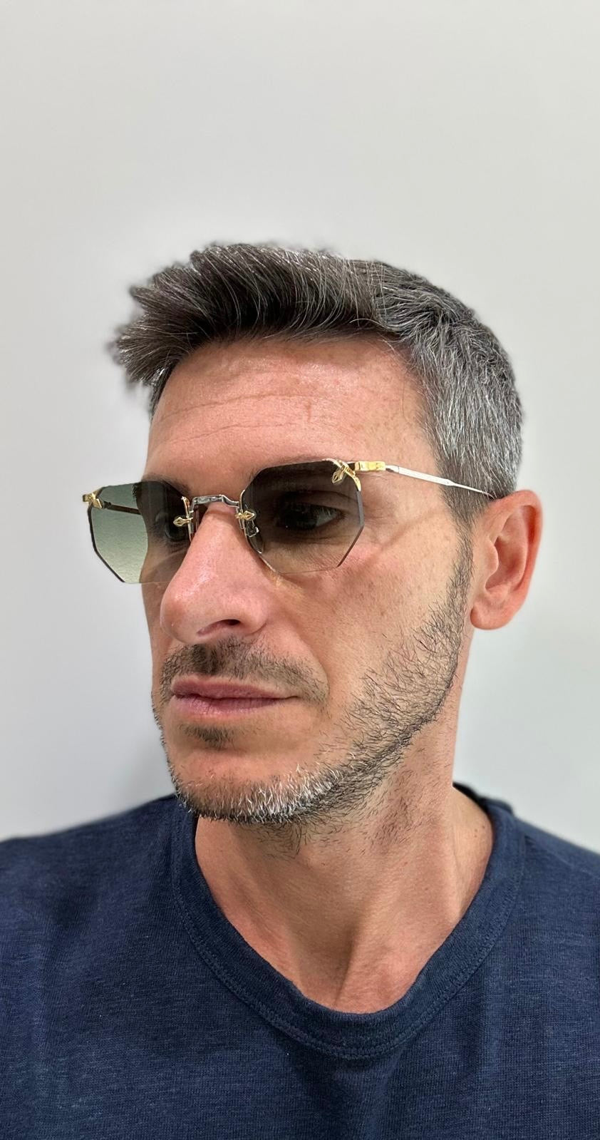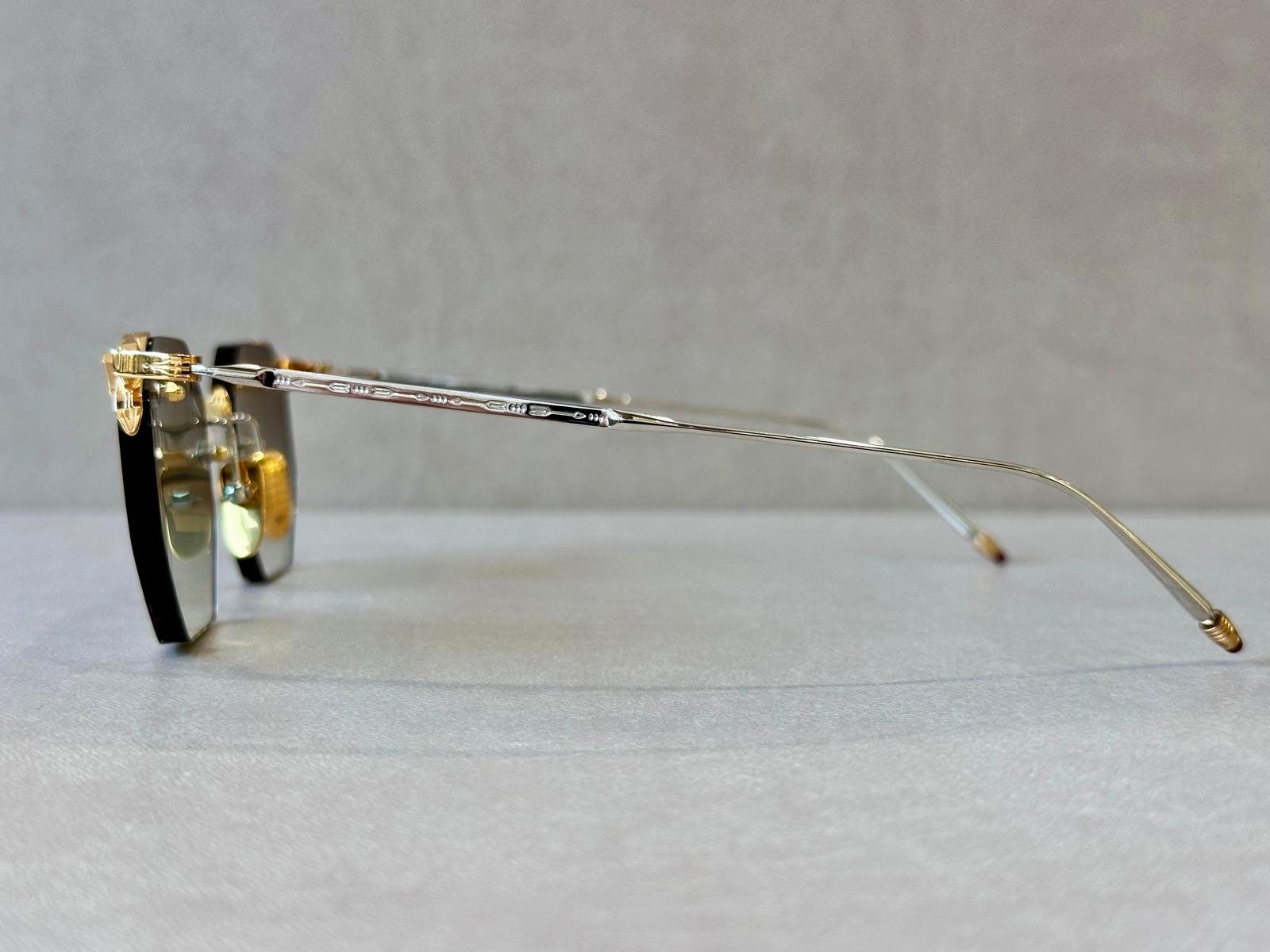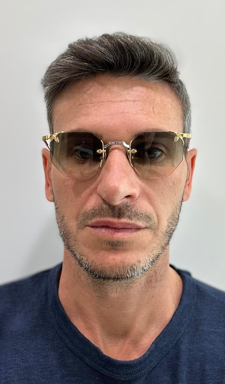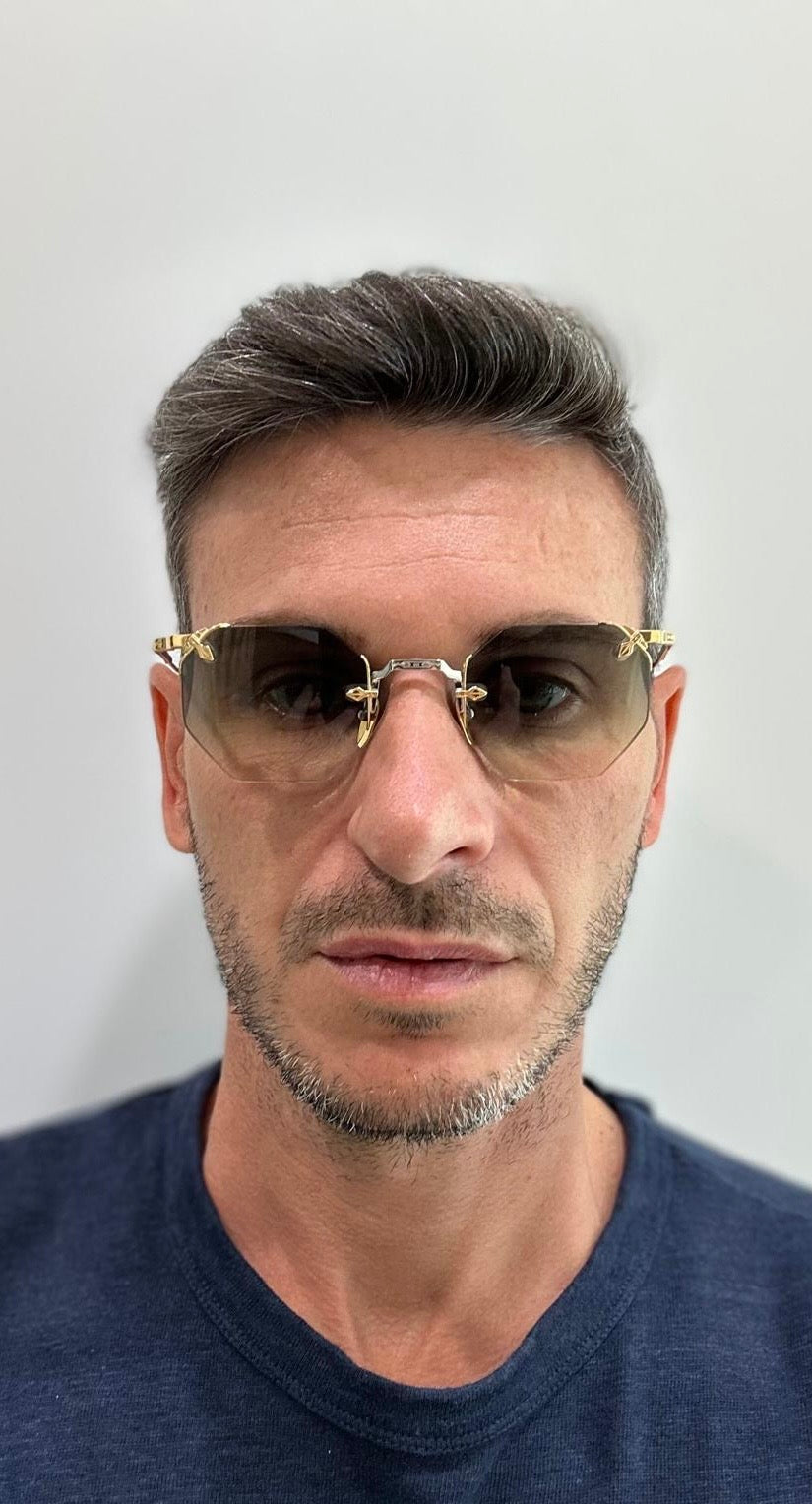 Una silhouette rimless dallo stile deciso, con aste alte e dettagli realizzati su misura, per chi non teme di farsi notare — in silenzio.
