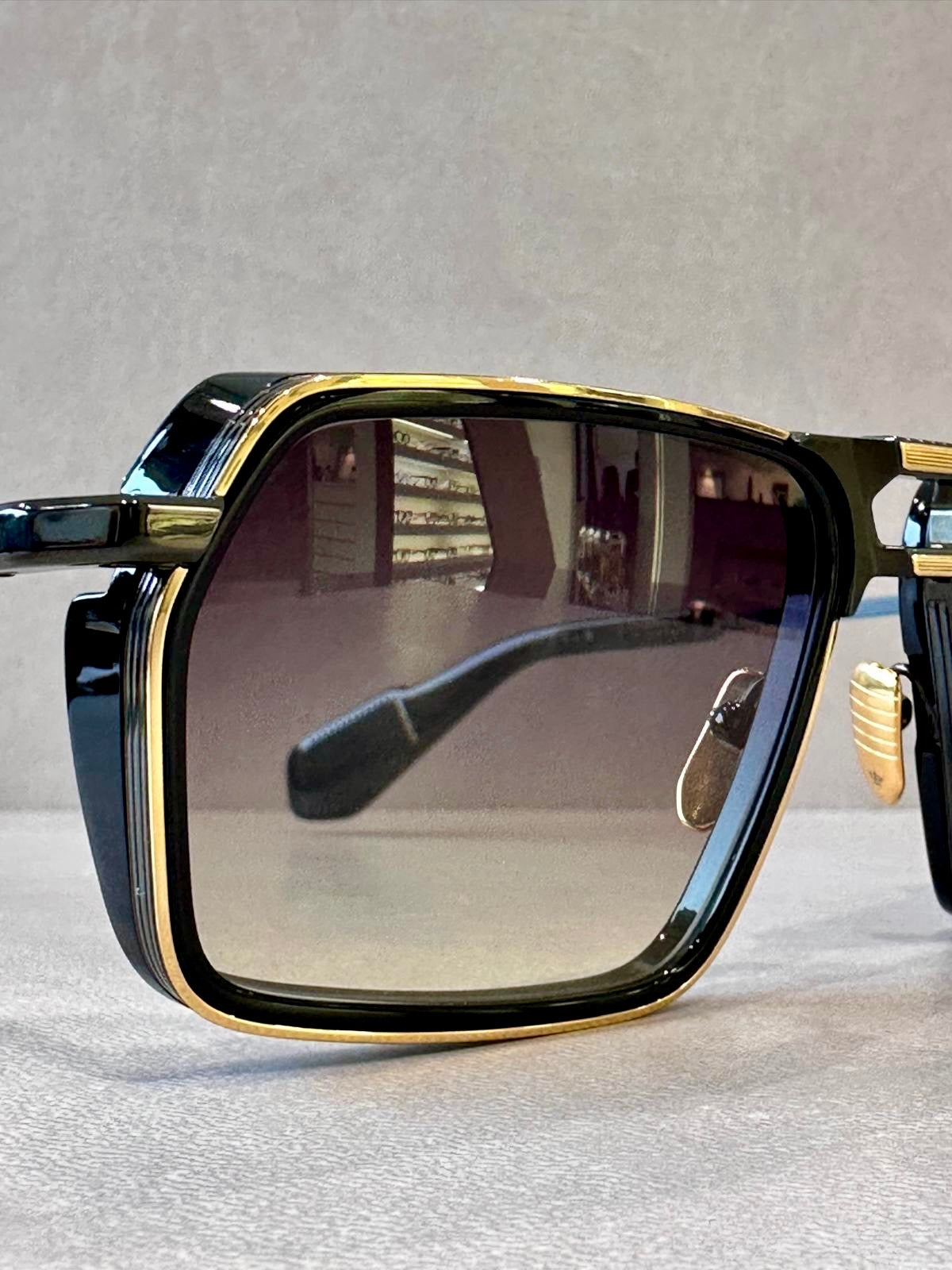 - Colorazione: Titanio nero con inserti in acetato nero lucido e lenti sfumate